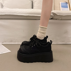 羊皮版~小皮鞋女5CM英伦风深口乐福鞋加绒系带小个子圆头粗跟单鞋