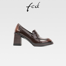 fed真皮粗跟厚底乐福鞋女复古小皮鞋一脚蹬圆头高跟深口通勤单鞋