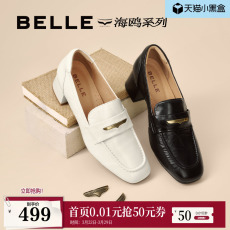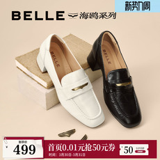百丽海鸥粗高跟乐福鞋女春季新款黑色小皮鞋深口单鞋子3PAF2CA5