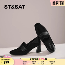 百丽复古粗高跟乐福鞋女26春季新款黑色小皮鞋深口单鞋F2H1DAA6