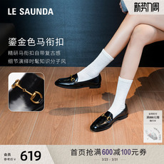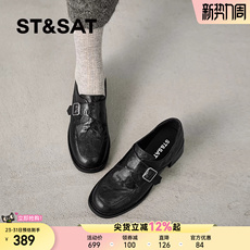 星期六黑色乐福鞋女春软底羊皮粗跟深口单鞋圆头皮带扣中跟小皮鞋