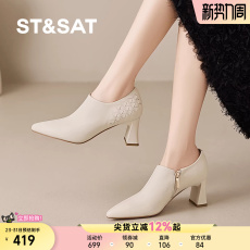 星期六羊皮通勤尖头深口单鞋女细跟高跟鞋显瘦气质不累脚白色皮鞋