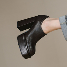 复古圆头粗跟单鞋女秋季新款真皮深口侧拉链防水台超高跟鞋女11cm