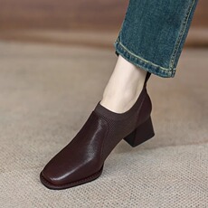 中跟深口单鞋女春秋新款软羊皮一脚蹬粗跟拼接针织方头气质小皮鞋
