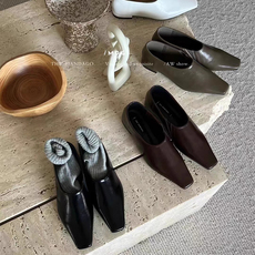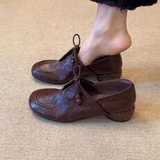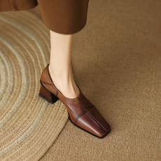 复古棕色方头皮鞋女粗跟秋季新款真皮一脚蹬高跟深口单鞋女8.5cm