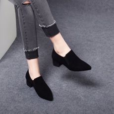 羊皮深口单鞋女磨砂皮中跟粗跟尖头女鞋子2023春秋真皮简约四季鞋