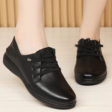 头层牛皮妈妈鞋秋冬季新款真皮平底深口单鞋女舒适不累脚系带皮鞋