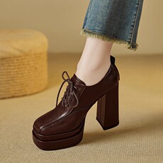 12cm防水台深口超高跟鞋女圆头粗跟小个子厚底不累脚系带单鞋棕色
