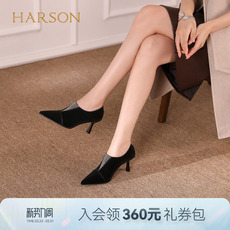 哈森复古绒面深口单鞋皮带扣黑色皮鞋粗高跟女鞋新款HL257131
