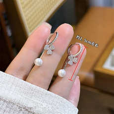 925银针小清新满钻三叶草珍珠耳扣长款简约气质通勤设计感耳饰女