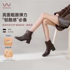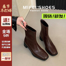 米霏!真皮~棕色方头瘦瘦靴女粗跟马丁靴切尔西高跟短靴大码女靴