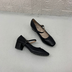 羊皮版~法式小尖头金属扣丝绒单鞋女粗跟不累脚玛丽珍鞋大码女鞋