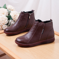 真皮妈妈鞋保暖短靴女平底休闲秋冬加绒中年老人棉鞋软底女鞋冬季