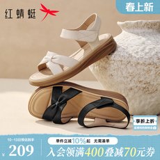 红蜻蜓女鞋真皮平底一字带妈妈凉鞋2024夏季新款百搭平底奶奶鞋