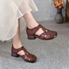 真皮网纱单鞋透气镂空玛丽珍鞋包头凉鞋女夏季新款粗跟软底妈妈鞋