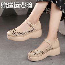 玛丽珍单鞋女一字扣厚底妈妈鞋夏季镂空包头凉鞋女真皮坡跟洞洞鞋
