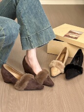titing气质托卡!复古绒面尖头毛毛边坡跟单鞋女冬加绒内增高单鞋