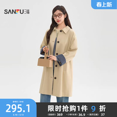 三福卡其色外套女2026新款春季格子内里宽松中长款风衣女装516782