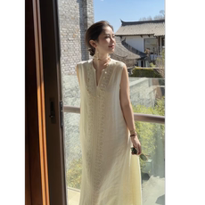 Y【叭哒不惑】白月光 亚麻气质长裙简约复古无袖连衣裙刺绣百搭