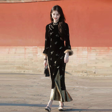 高端金丝绒连衣裙子中长款春秋冬季大码胖m显瘦气质打底直筒a字裙