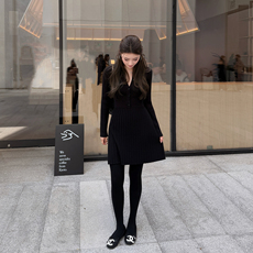DPLAY2025年冬季新款黑色连衣裙女下摆开叉气质毛衣裙针织裙短裙