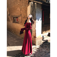 2025新款蓝色丝绒连衣裙女秋冬V领长袖收腰A字显瘦气质晚宴礼服裙