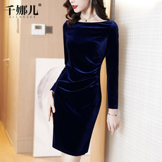 宝蓝色金丝绒连衣裙女秋冬装2025新款一字肩高端气质显瘦包臀裙子