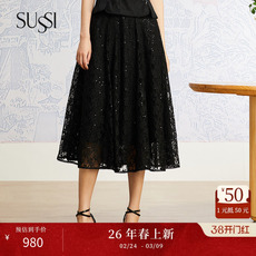 SUSSI/古色商场同款黑色气质百搭下摆花边A摆半身裙女
