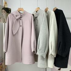 冬季新款日系甜美蝴蝶结中长款毛呢大衣小个子百搭蕾丝爱心外套女