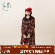 紫涵复古红色格纹毛呢大衣女士冬季新款娃娃领蝴蝶结中长款呢外套