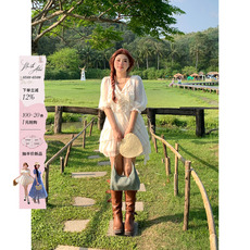 大婷婷夏季法式浪漫感温柔短袖镂空领连衣群修身时尚裙子DT1337