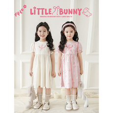咖沫原创法式复古印花兔子图案飞袖连衣裙女短袖浪漫超仙显瘦裙子