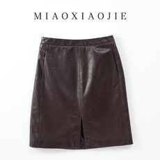 欧洲站 油蜡皮真皮小羊皮包臀裙前开叉高腰a字半身裙女2025秋新款