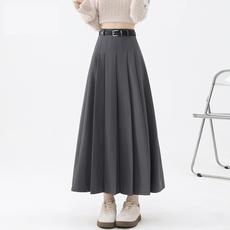 灰色百褶西装裙女春秋半身裙高腰休闲大摆a字夏季毛呢过膝中长裙