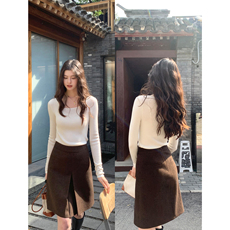 卡其色直筒半身裙女春秋冬高腰开叉包臀a字裙中长款羊绒毛呢裙子