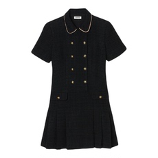 季末6折SANDRO2025秋冬新款女装甜美白色小花边娃娃领百褶连衣裙