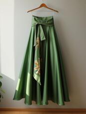 品牌折扣专柜外贸女装今年流行绿色印花朵系带收腰大裙摆半身裙子