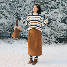 时然大码麂皮半身裙微胖mm冬女装加厚复古休闲半裙高腰通勤A字裙