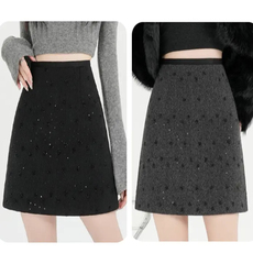 重工亮片毛呢半身裙秋冬新款大码加厚高腰气质显瘦包臀中裙A字裙