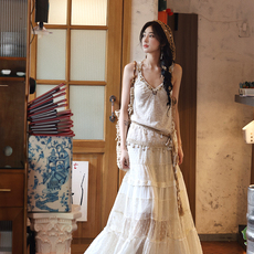 Emilyying2025新款米杏色日系vintage纯苎麻重工花边背心裙
