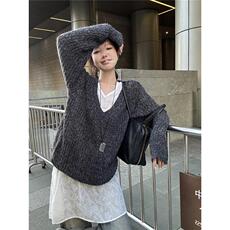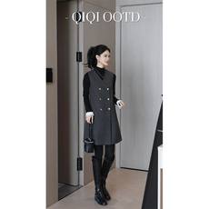 pusumede优雅格调 经典V领毛呢背心裙女气质叠穿中长款无袖连衣裙