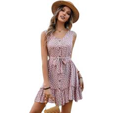 欧美V领单排扣棉绸点点印花无袖收腰A字荷叶边背心连衣裙女DRESS