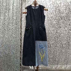 米兰小镇南油版本欧货下摆撞色拼接刺绣大花修身无袖牛仔背心裙C1