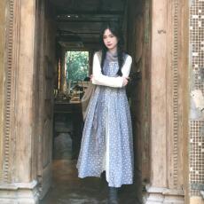 Pinkstar Shop早春新款浪漫主义女作家灰蓝色碎花双层棉背心裙