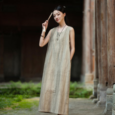 26原创棉麻女装苎麻棉薄款脏染中式长裙女宽松文艺无袖背心连衣裙