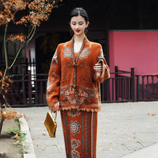 澄渔高定【杏芙莲鲤】明制汉风橘棕羊毛浣熊绒针织上衣背心裙套装