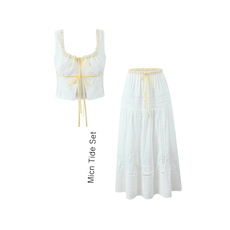 怪诞女孩 海边度假风提花蕾丝挂脖背心高腰荷叶边半身裙两件套女