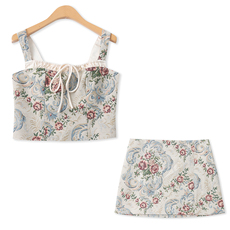 度假风穿搭甜辣纯欲风荷叶边挂脖背心女夏季高腰印花半身裙两件套