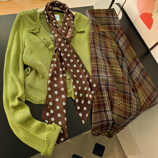 古早味辣妹!绿色针织开衫叠穿吊带背心波点丝巾格子半身裙女套装