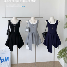 韩式撞色无袖连衣裙女修身不规则背心裙显身材短裙